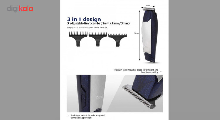 ماشین اصلاح مدل km-5021 ساخت شرکت کیمی، تیغه های این ماشین اصلاح از استیل ضد زنگ ساخته شده است که در مقابل هوا و رطوبت از مقاومت خیلی بالایی برخودار است. تکنولوژی برش این ماشین اصلاح بصورت مستقیم می باشد و به راحتی موها را با مرزبندی مشخصی کوتاه می کند. سری اصلی این ماشین اصلاح موهای سر وصورت را از 0.5 تا 2.5 سانتی متر واسه ی شما کوتاه می کند. به همراه این ماشین اصلاح سه عدد شانه ارایه شده است و می توان از آن ها برای کوتاه کردن مو و سایه انداختن استفاده کرد. باتری ماشین اصلاح کیمی مدل km-5021 در مدت 8 ساعت بطور کامل شارژ می شود بعد از شارژ کامل دستگاه می توان از آن به مدت 60 دقیقه پیوسته استفاده کرد. همچنین به همراه این ماشین اصلاح روغن و برس ارایه شده است تا شما بتوانید پس از هر بار اصلاح تیغه را به خوبی تمیز و مرتب کرد