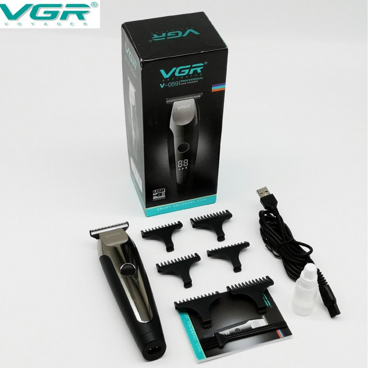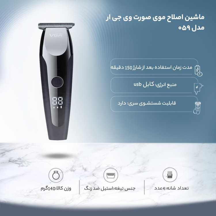 دستگاه وی جی ار مدل 059 مخصوص اصلاح مو صورت و بدن میباشد که دارای نمایشگر دیجیتال و سه سرعته میباشد . این دستگاه دارای 6 عدد شانه از سایز 1 تا 6 را دارا مباشد و با 3 ساعت شارژ این دستگاه 150 دقیقه قابل استفاده میباشد