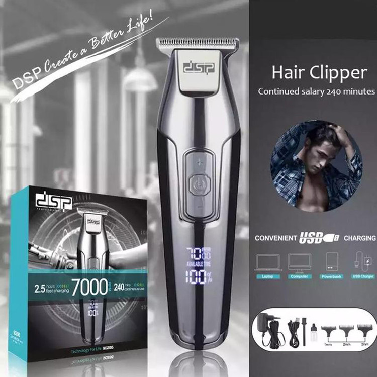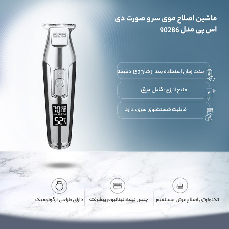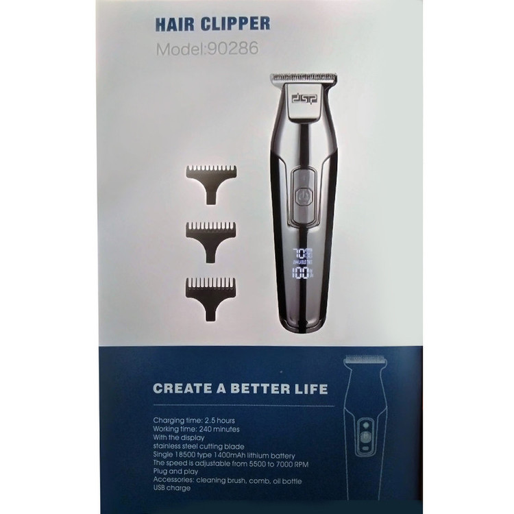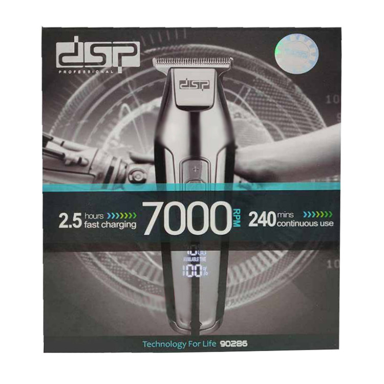 ماشین اصلاح دی اس پی مدل 90286 یکی از قوی ترین ماشین هایی است که کمتر شبیه آن را خواهید دید. موتور با توان بالای 5 وات با جریان 60 هرتز و 7000 دور بر دقیقه است. به کمک کلید های کم و زیاد روی بدنه میتوان سرعت چرخش و اصلاح را از 5500 تا 7000 دور تغییر داد. از دیگر خصوصیت های این دستگاه باتری لیتیومی و قابلیت نگهداری شارژ به مدت 240 دقیقه (4ساعت) و کار به صورت مداوم و پیوسته به مدت 4 ساعت و نیز قابلیت پشتیبانی شارژ سریع و همچنین شارژ با کابل USB است. آنچه بر روی بدنه این دستگاه خواهید دید: کلید خاموش و روشن، کلید های افزایش و کاهش سرعت اصلاح و میزان شارژ است که به صورت دیجیتال با صفحه نمایش روی دستگاه به راحتی می توانید ببینید. شما میتوانید با کابل USB ماشین را با لپ تاپ و حتی پاور بانک خود شارژ کنید.