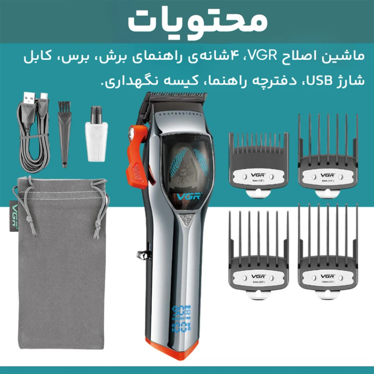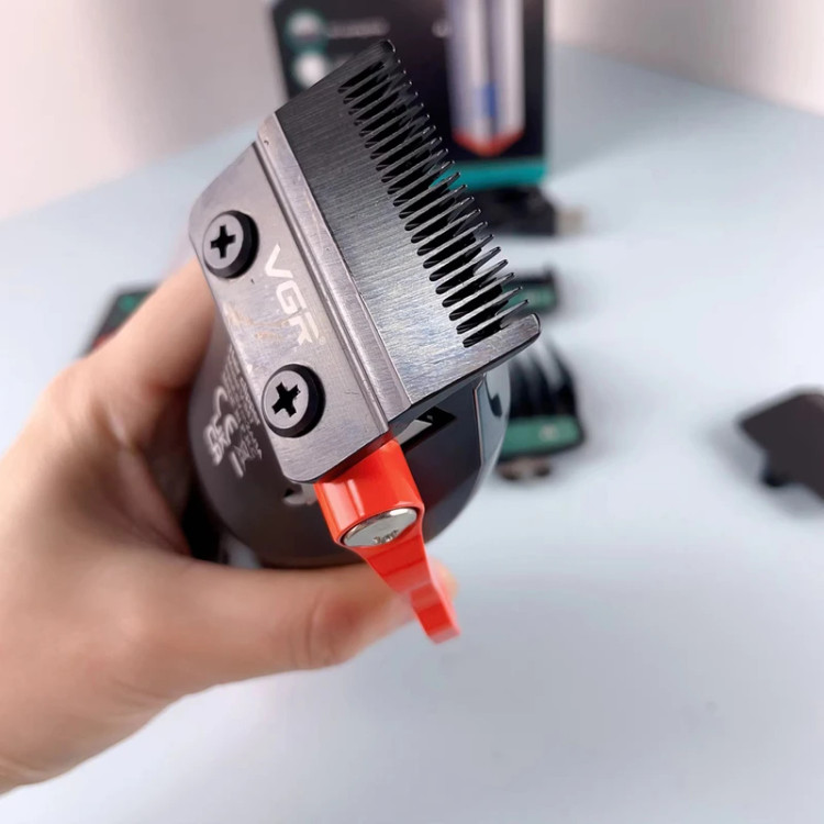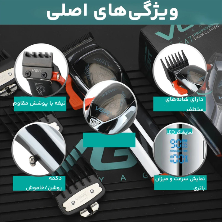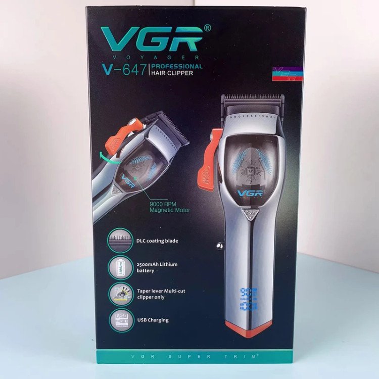 ماشین اصلاح موی سر وی جی آر مدل v-647 یک ماشین اصلاح حجم زن با طراحی به غایت زیباست. دارای یک موتور مغناطیسی است که باعث می شود در طول کار گرم نشود و به طور مداوم بتوان از آن استفاده کرد. دارای یک باطری باتری 2500 میلی آمپر و به دور موتور 7000 دور در دقیقه تجهیز شده است. نشانگر دور موتور و وضعیت باطری شما را از وضعیت موتور و باطری مطلق می سازد. متناسب با نیاز برق دستگاه یک آداپتور همراه دستگاه قرار داده شده تا از بورد و باطری دستگاه محافظت شود. علاوه بر این یک شانه اصلاح و سه عدد شانه راهنما، برس تمیزکننده دستگاه و روغن روان کننده ارائه شده است.
