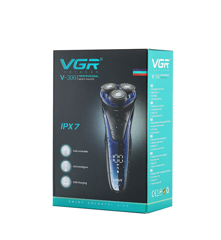 آنالیز ریش تراش سه تیغ VGR مدل 306-V ماشین اصلاح ریش تراش سه تیغ برند وی جی آر مدل وی 306 دارای تکنولوژی اصلاح بصورت برش چرخشی می باشد تیغه های آن از جنس استیل ضد زنگ با قابلیت اصلاح با شماره صفر می باشد قدرت این ماشین اصلاح بسیار بالا بوده و کارایی آن فوق العاده می باشد این ماشین ریش تراش عملکرد بسیار عالی دارد و شما می توانید از آن در زیر دوش ، بصورت مرطوب ، به وسیله مواد اصلاح کف ریش و ... اصلاح انجام دهید این ماشین اصلاح کامل ضد آب بوده و یک شیور عالی می باشد همچنین در پشت دستگاه یک عدد خط زن با تکنولوژی اصلاح مستقیم وجود دارد به وسیله آن می توان خط ریش خود مرتب نمود و در داین و زنگ آبی و نقره ای عرضه شده است منبع تغذیه این ماشین اصلاح باتری قابل شارژ بی سیم می باشد که شارژ کامل آن 90 دقیقه زمان نیاز دارد و قابلیت استفاده تا 90 دقیقه را دارد همچنین دارای صفحه نمایشگر LED می باشد طراحی آن آرگونومیک بوده و ولتاژ آن جهانی می باشد